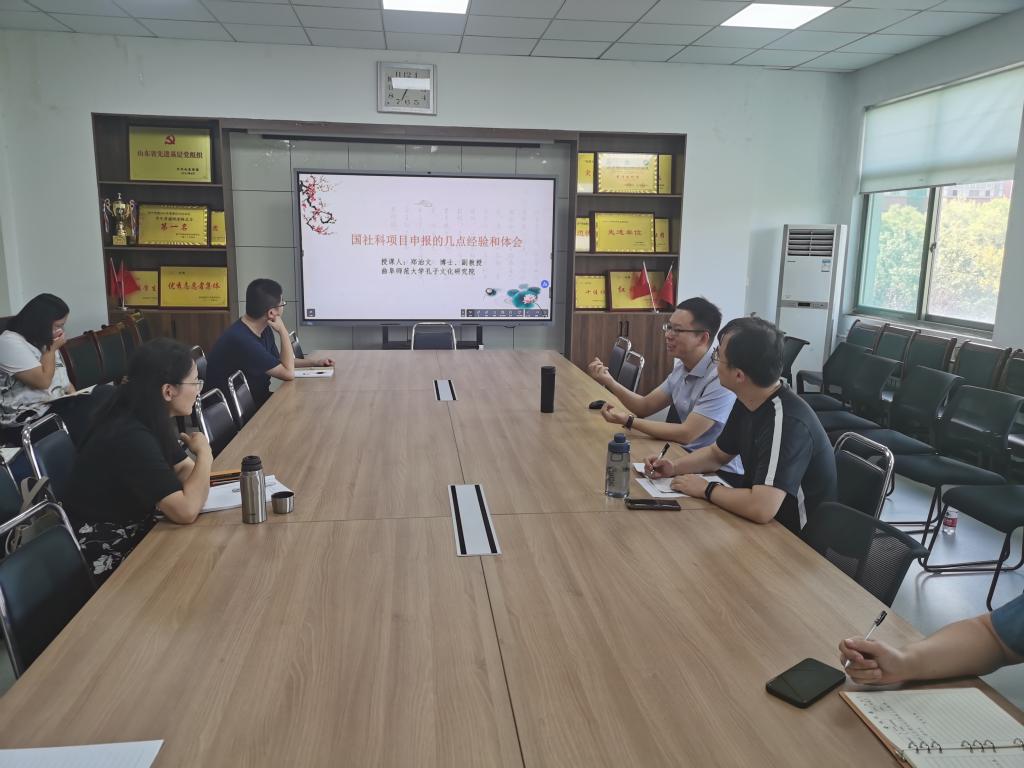 为进一步提高儒商学院教师申报国家社科基金项目的积极性、营造浓厚的学术氛围。2023年9月14日下午,儒商学院邀请曲阜师范大学孔子文化研究院副教授、硕士研究生导师郑治文博士为学院教师作“国家社科基金项目申报的几点经验和体会”学术报告。学院相关博士、青年教师参加报告会,报告会由该院副教授张冠甲博士主持。