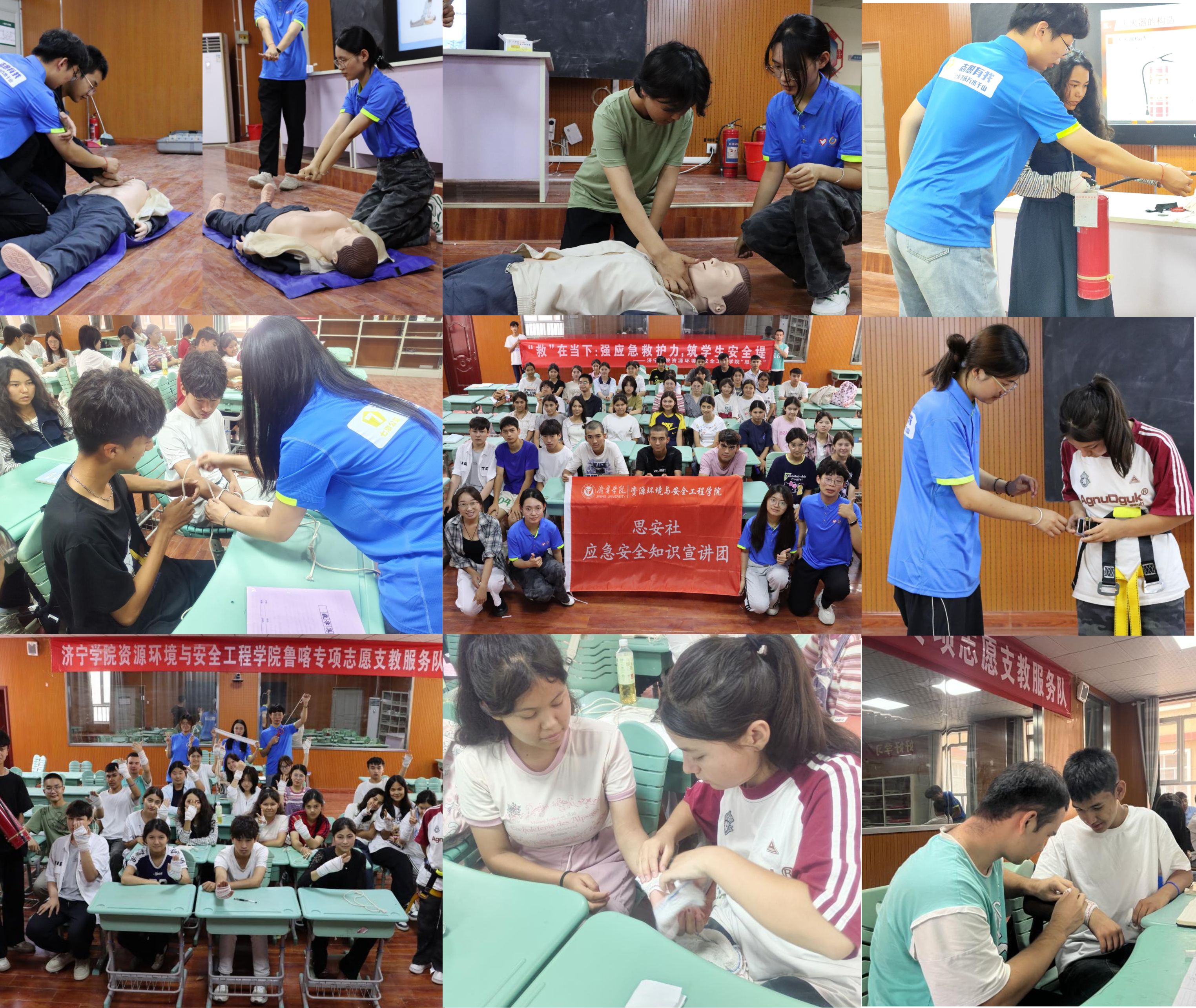 将安全知识转化为生存本能。安全工程专业学子将专业社团“思安社”的应急安全知识宣讲带到英吉沙县实验中学,聚焦防溺水“六不原则”情景演练、心肺复苏“黄金四分钟”实操、安全绳结逃生术、应急包扎技法、灭火器使用等五大模块,通过一对一模拟训练,将五大应急技能熔铸成环环相扣的生命守护链,让抽象的安全知识沉淀为边疆学子指尖的肌肉记忆,让昆仑山下的青春脉搏跳动得更稳健、更坚韧。